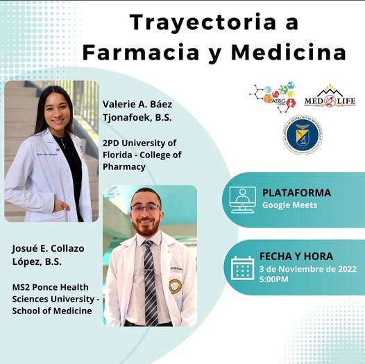 El jueves, 3/nov, tendremos una segunda orientación a las 5:00pm de manera virtual sobre la trayectoria a farmacia y medicina. Brindada por Josué E. Collazo López (B.S.) y Valerie A. Báez Tjonafoek (B.S.). La misma los ayudará ha aclarar algunas dudas que surgen sobre ese gran proceso para algunos sobre la trayectoria a farmacia y medicina. Enlace de la reunión:👇🏻