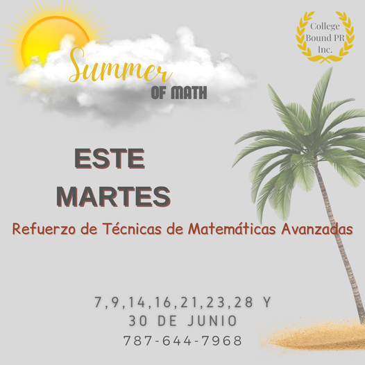 Este mes de Junio tendremos nuestro curso de Refuerzos de Matemática Avanzada. Todo aquel estudiante que necesite mejorar sus destrezas en álgebra, trigonometría, geometría, pre- cálculo y cálculo podrá tenerlo en nuestro curso. Estaremos ofreciéndolos de forma presencial, dos sesiones por día, dos veces en semana. De 9:00 am 12:00 pm y la segunda sesión de 1:30 pm a 4:30 pm
