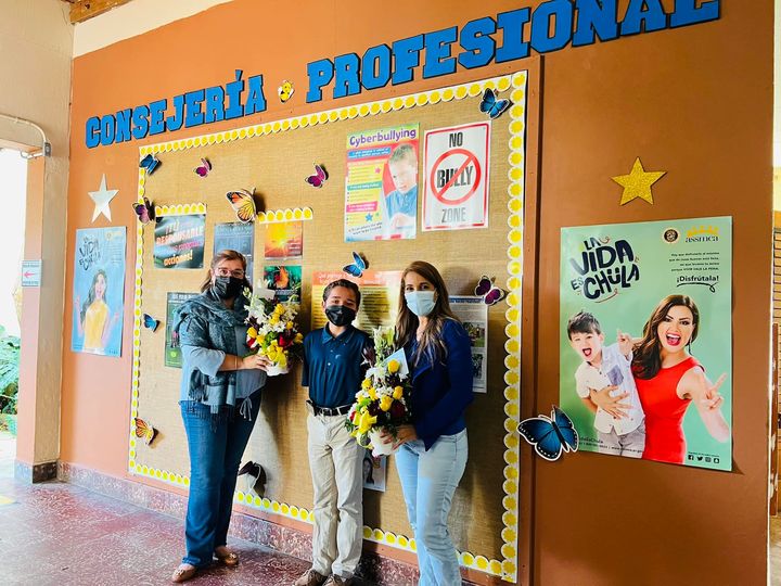 Sebastián Toro del séptimo grado las acompaña en la entrega de un obsequio de parte de todos los alumnos, facultad y toda la comunidad escolar. Gracias por su labor. 💙💛