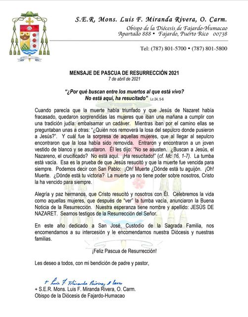 Mensaje de Pascua de Resurrección de S.E.R. Mona. Luis F. Miranda Rivera, O. Carm., Obispo de la Diócesis de Fajardo-Humacao.