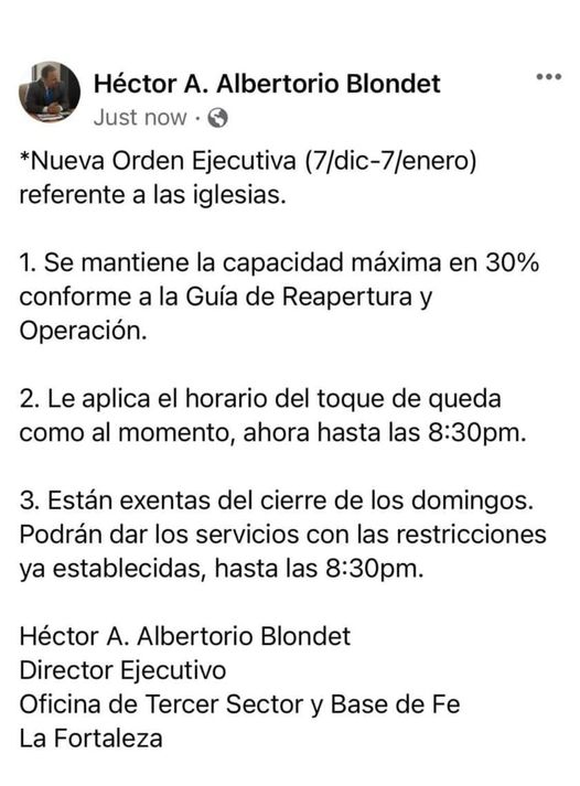 Estas son las instrucciones del gobierno referente a las Iglesias en Puerto Rico ante la Nueva Orden Ejecutiva que se extiende desde el 7 de diciembre hasta el 7 de enero 2021.