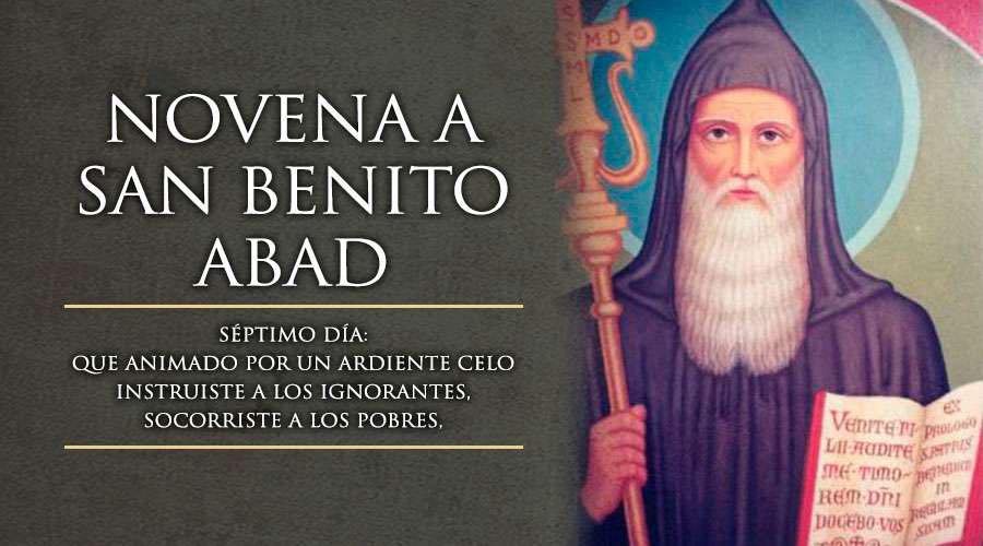 ¡Oh glorioso San Benito, que animado por un ardiente celo para asistir al prójimo en sus necesidades, instruiste a los ignorantes, socorriste a los pobres, curaste a los
