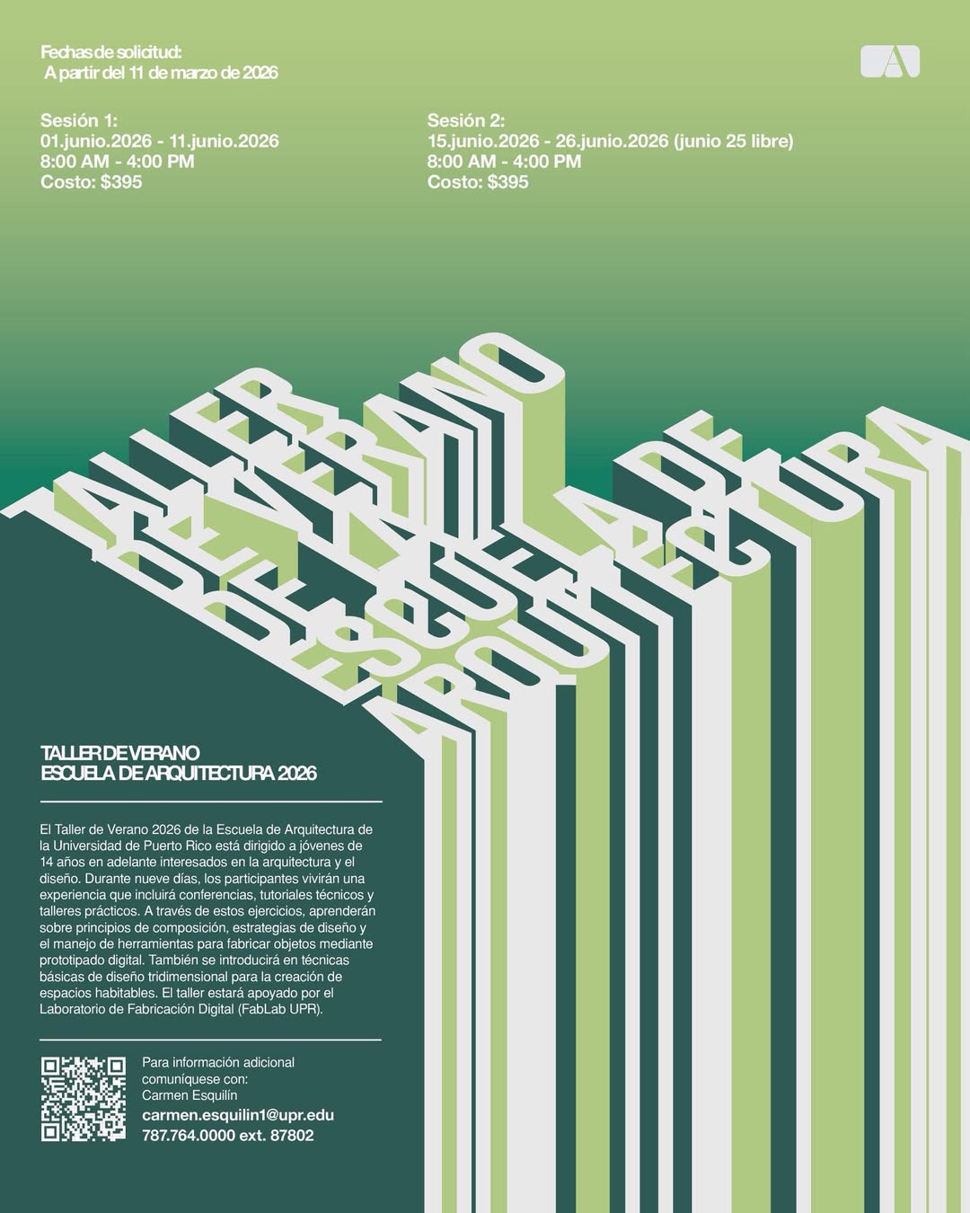 El Taller de Verano 2026 de la Escuela de Arquitectura de la Universidad de Puerto Rico está dirigido a jóvenes de 14 años en adelante interesados en la arquitectura y el diseño. Durante nueve días, los participantes vivirán una experiencia que incluirá conferencias, tutoriales tecnicos y talleres prácticos. A través de estos ejercicios, aprenderán sobre principios de composición, estrategias de diseño y el manejo de herramientas para fabricar objetos mediante prototipado digital. También se introducirá en técnicas básicas de diseño tridimensional para la creación de espacios habitables. El taller estará apoyado por el Laboratorio de Fabricación Digital (FabLab UPR).