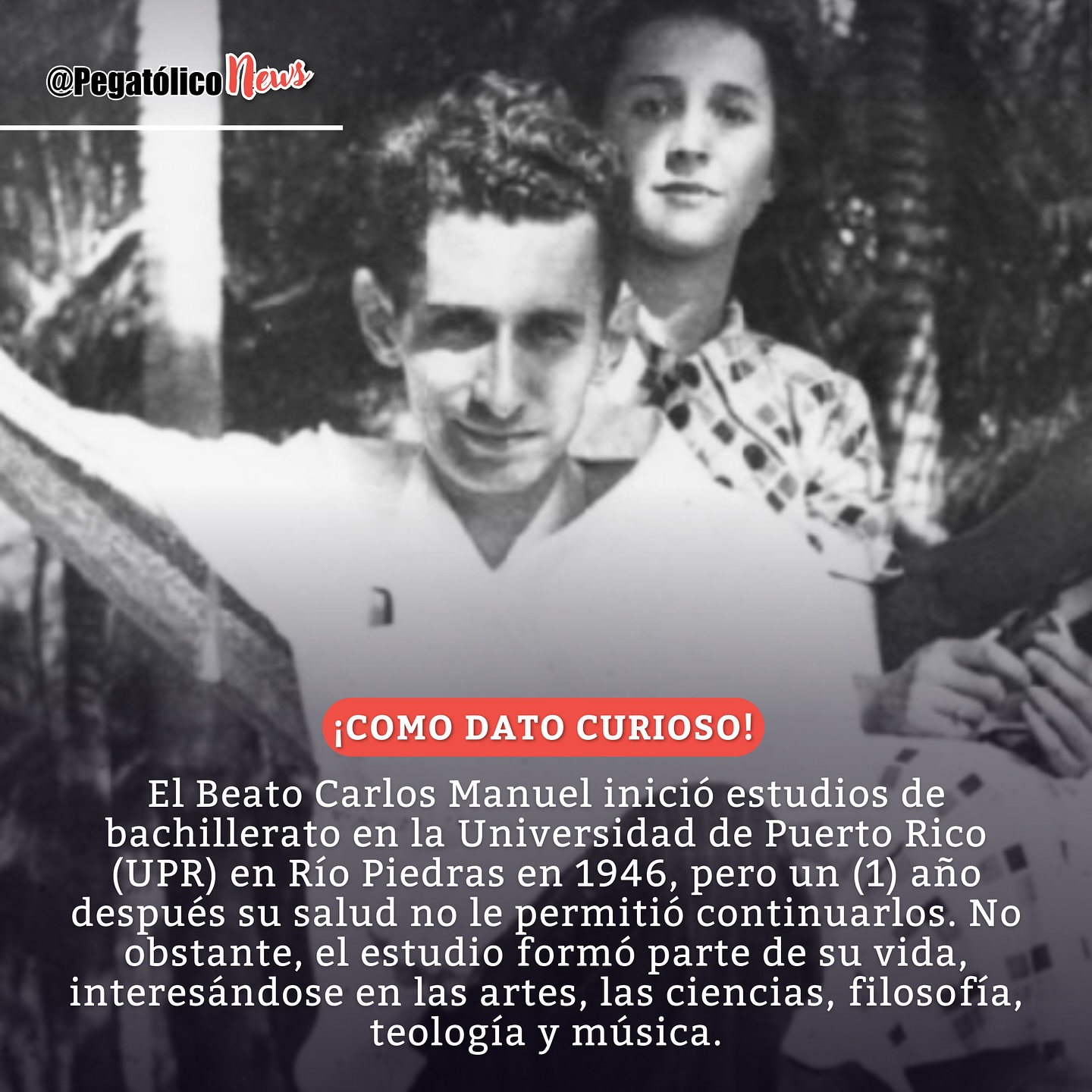 👨🏻🏫 Como dato curioso, el Beato Carlos Manuel inició estudios de bachillerato en la Universidad de Puerto Rico (UPR) en Río Piedras en 1946, pero un año después su salud no le permitió continuarlos. No obstante, el estudio formó parte de su vida, interesándose en las artes, las ciencias, filosofía, teología y música.